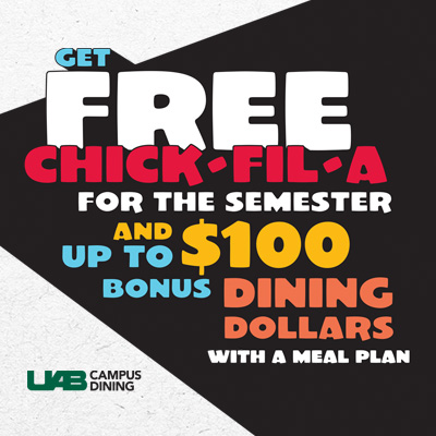 From January 13-31, UAB Campus Dining will be running a deal to assist commuters with selecting meal plans, and the purchase of a meal plan comes with a free Chick-Fil-A (CFA) for the semester (limited to 1 per week)